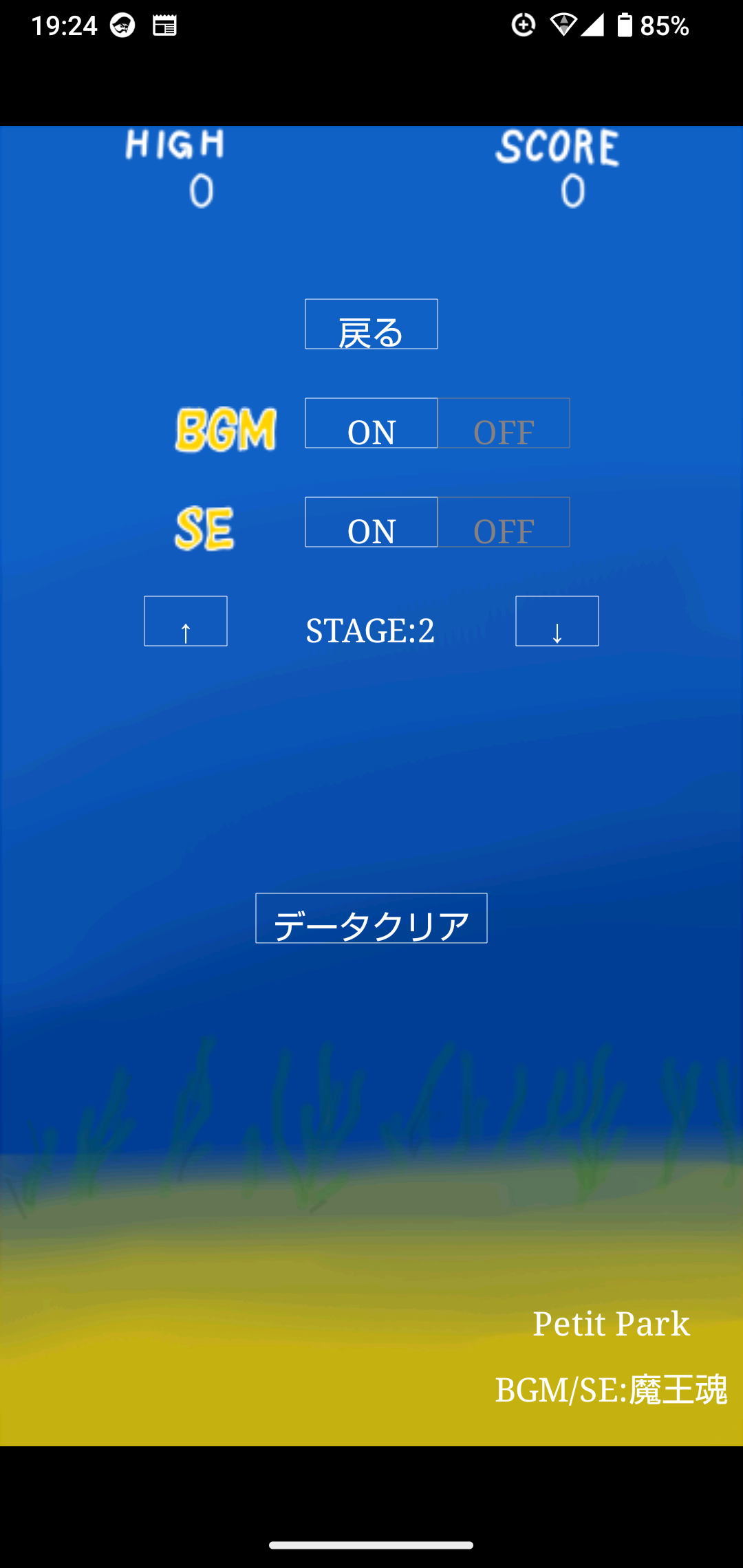 オプション画面の「データクリア」を押下することで、ゲーム内のデータ(ハイスコア等)を削除できます。